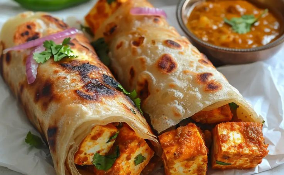 Assemble the Kathi roll: Place a cooked paratha on a flat surface. Spread a layer of green chutney or ketchup. Add the cooked filling in the center, sprinkle with coriander leaves, and squeeze some lemon juice. Roll it up: Fold the paratha from one side, roll it up, and secure with a toothpick or wrap in foil or parchment paper for easier handling.