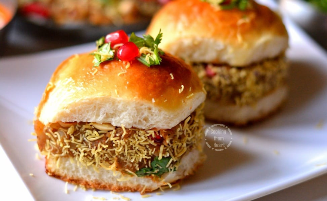 Slice the pav buns in half and lightly toast them with butter on a flat pan or tawa. Spread a layer of tamarind chutney on one side and a layer of garlic chutney on the other side of the pav. Place a generous amount of the prepared potato filling on the bottom half of the pav. Sprinkle chopped onions, fresh coriander, and a handful of sev over the potato filling. Close the pav with the other half and press it gently.
