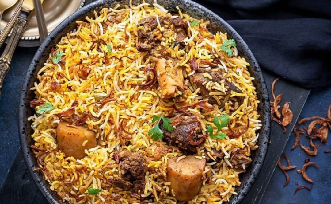 Add spices and marinated mutton: In the same pot, add whole spices (bay leaves, cinnamon stick, cloves, cardamom) to the oil. Sauté for a minute until fragrant. Add the marinated mutton and slit green chilies. Cook on medium heat until the mutton is browned and tender (about 15-20 minutes). Add water: Once the mutton is tender, add enough water to cover the meat (about 1.5-2 cups, depending on the quantity of mutton) and bring it to a boil. Simmer for about 15-20 minutes. Cook the rice: In a separate pot, boil water with a little salt. Add the soaked and drained basmati rice and cook until the rice is 70% cooked (it should still have a bite). Drain and set aside. Layer the biryani: Once the mutton is cooked and the gravy is slightly thick, layer the partially cooked rice over the mutton. Spread it evenly. Sprinkle the reserved fried onions, fresh coriander leaves, and mint leaves over the top. Dum cooking: Cover the pot with a tight lid (you can seal the edges with dough or a kitchen towel to trap steam) and cook on low heat for 20-25 minutes. This allows the flavors to meld and the rice to finish cooking. Serve: Gently fluff the biryani with a fork and serve hot with raita (yogurt sauce) or salad