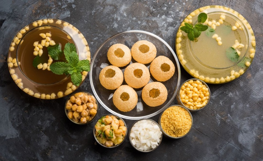 Make a small hole in the center of each puri. Fill the puris with the potato mixture, chickpeas, and a little chopped onion. Dip the filled puris into the chilled pani and enjoy immediately!